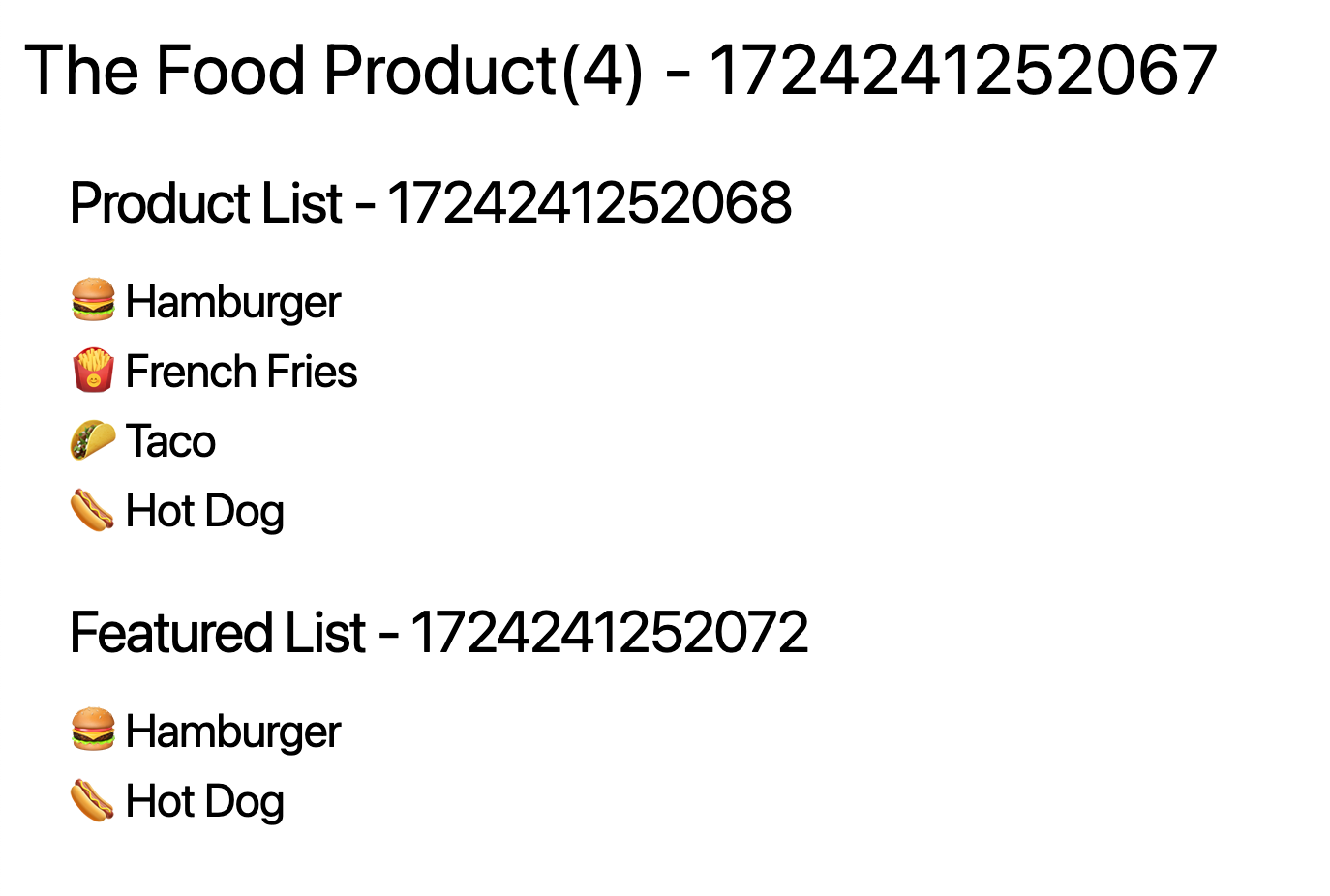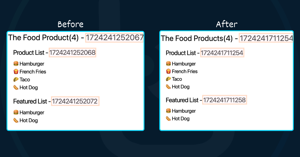 Большое число, которое вы видите рядом с заголовками — это временная метка (используя простую функцию Date.now() из JavaScript Date API), которую мы добавили в код компонента. Теперь что произойдет, если мы изменим значение пропса heading компонента ProductPage?