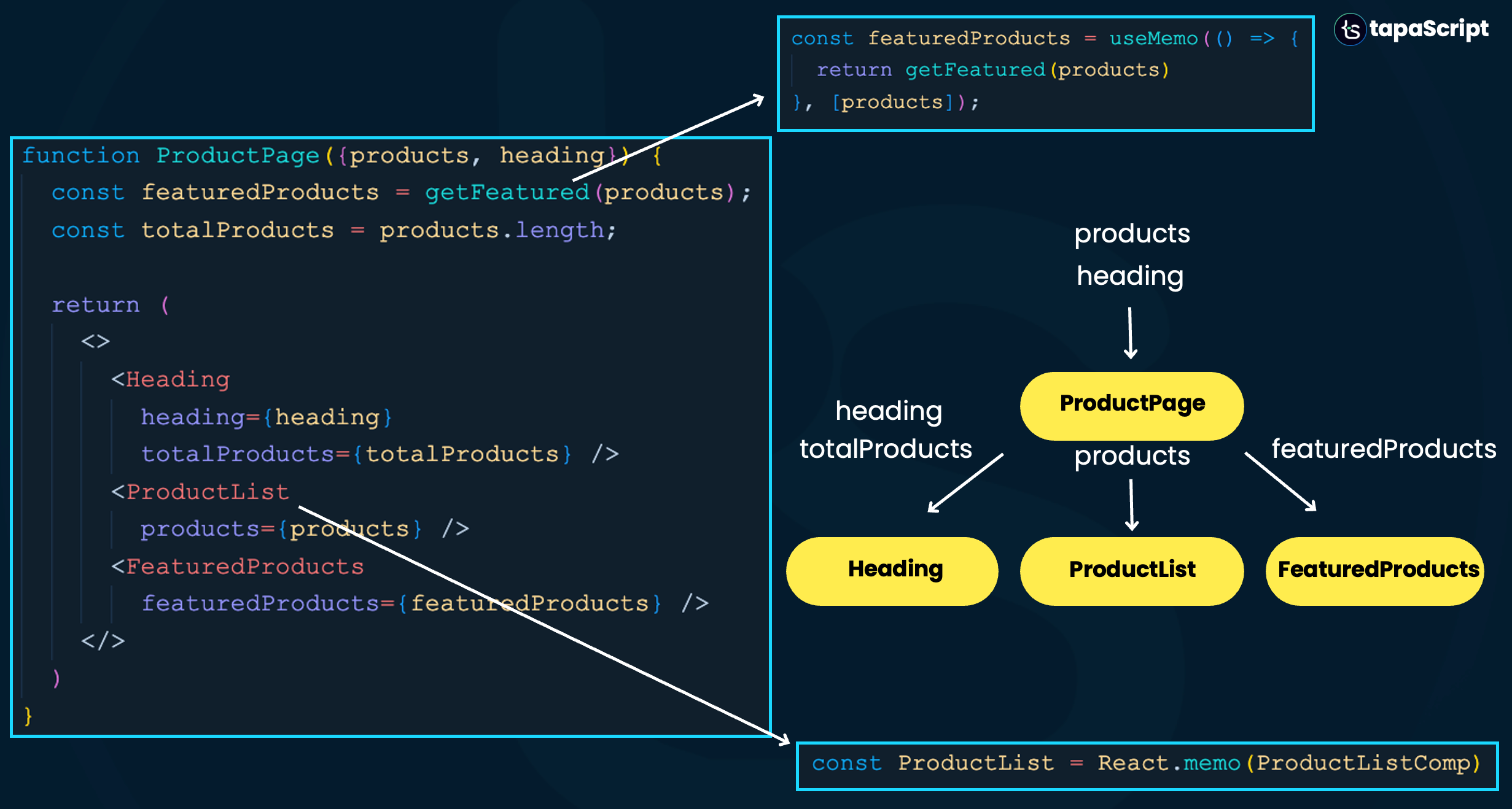 Мы можем использовать хук useMemo() для мемоизации вычисления рекомендуемых продуктов. Обе реализации указаны на изображении ниже.