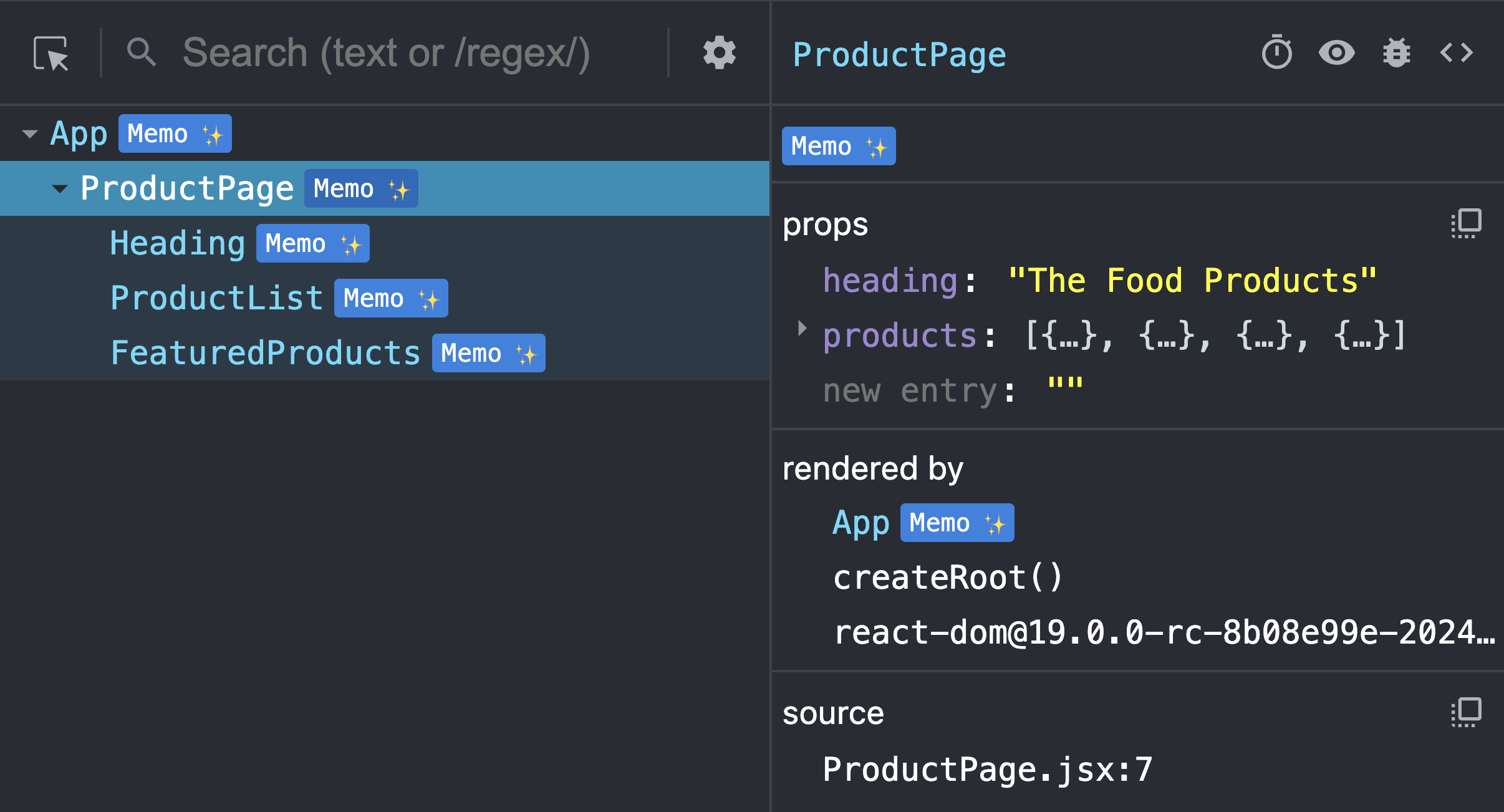 React DevTools версии 5.0+ имеет встроенную поддержку React Compiler. Вы увидите значок с текстом Memo ✨ рядом с компонентами, оптимизированными React Compiler. Это фантастично!